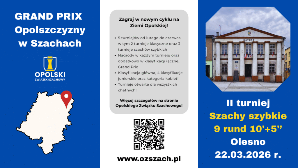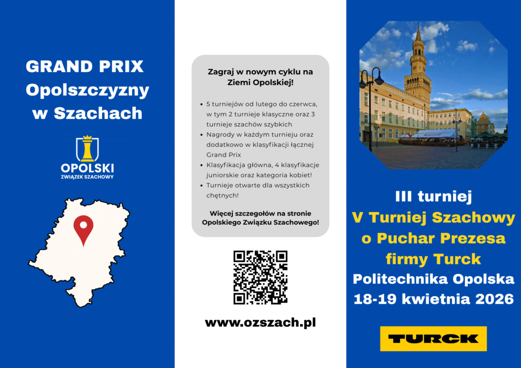 Grand Prix Opolszczyzny Komunikat Organizacyjny Grand Prix Turniej I - VII Puchar Strzelca w Szachach - Strzelce Opolskie, 14-15 lutego 2026 r. Komunikat Grupa A Grupa B Grupa C Grand Prix Opolszczyzny 2026 - turniej II - Olesno, 22.03.2026 r. Komunikat Serwis turniejowy Turniej III - V Turniej Szachowy o Puchar Prezesa firmy Turck Komunikat Grupa A Grupa B Grupa C